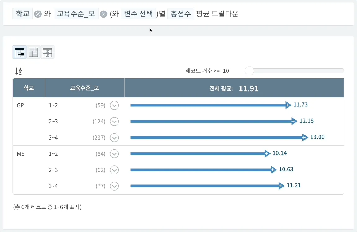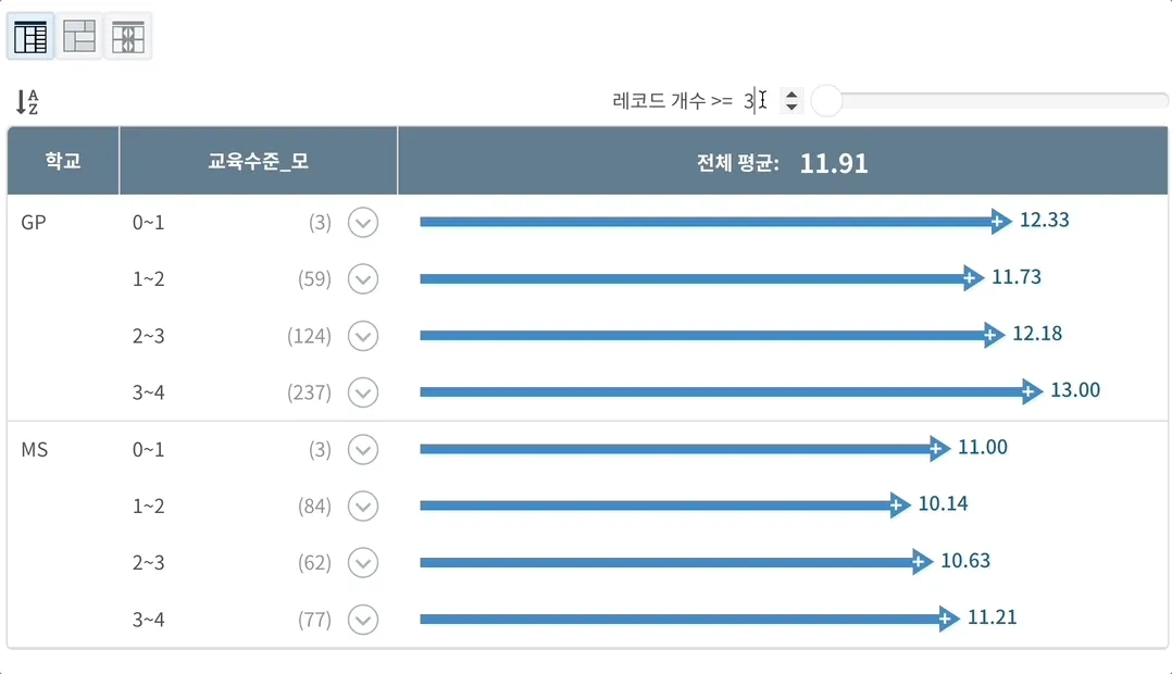 먼저 어머니의 교육수준에 따른 총점수 평균의 차이다. 가장 어머니의 교육수준이 낮은 학생들(각 학교에 3명)은 표본 수가 너무 많으니 필터로 제외하고 논외로 두면, 평균적으로 어머니의 교육 수준이 높을수록 자식의 점수 평균도 높은 것으로 보인다.