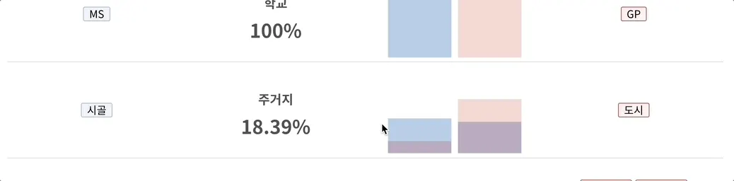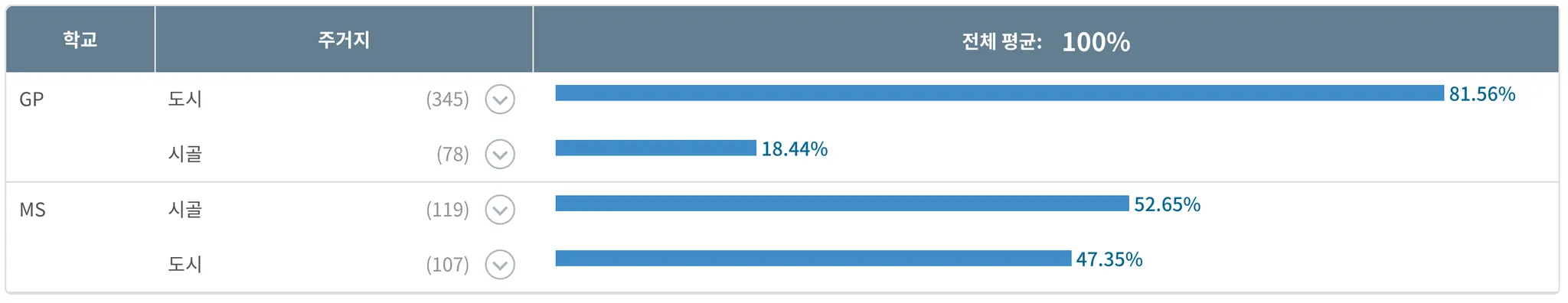 두 학교에 대한 비교이기 때문에 당연히 학교는 100% 차이가 날 것이니, 두 번째 변수부터 확인해보자. 가장 차이가 많이 나는 특징은 바로 주거지다.