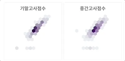 가장 연관성이 높은 변수들(상관계수가 높은 변수들)은 물론 기말고사점수와 중간고사점수다. 두 점수의 합 + 기타 평가지표가 총 점수가 되었을 것이기에 높은 양의 상관관계를 띄고 있다.