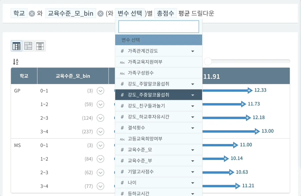 ⇒ 전반적으로 어머니의 교육수준이 높으면 학생의 성적이 높기는 하지만, 교육수준_모_bin 각 그룹 내에서는 주평균공부시간이 높았던 학생들이 더 좋은 성적을 받았다.
