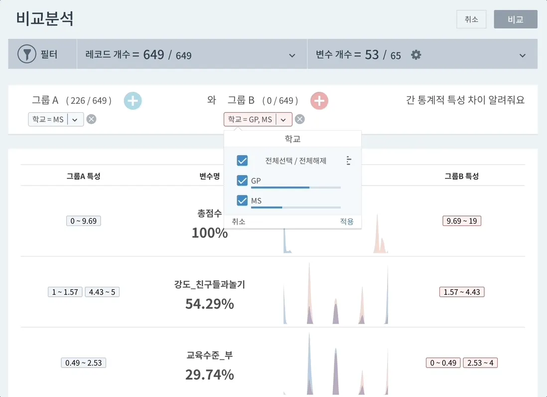 두 학교의 차이를 비교 분석을 통해 데이터 내에서 확인해보자.