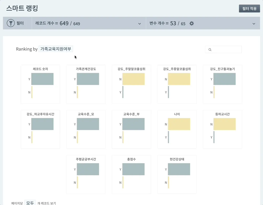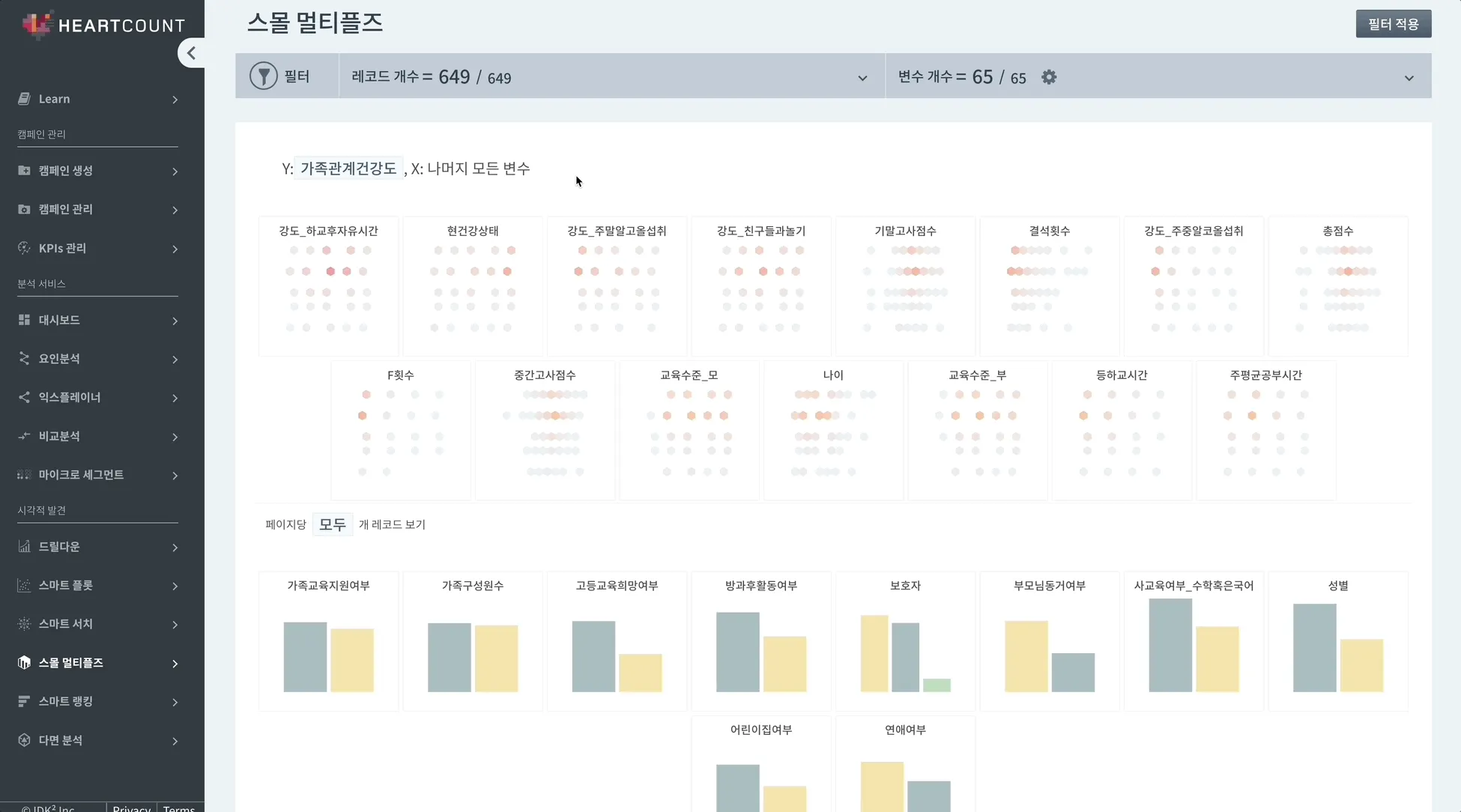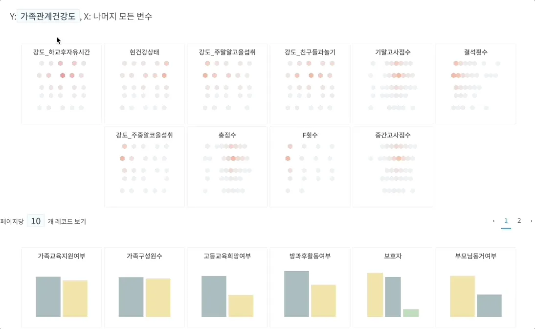 그럼 총점수와 다른 모든 변수와의 상관관계를 확인해보자. 작은 박스 하나하나에 바차트 혹은 산점도가 그려진다. 이처럼 일련의 유사한 차트로 하나의 화면을 구성한 것을 스몰 멀티플즈라고 부른다. 데이터라는 바다에서 그 다음에 어디로 항해의 방향을 잡아 분석을 진행할 지 파악할 때 유용하다.