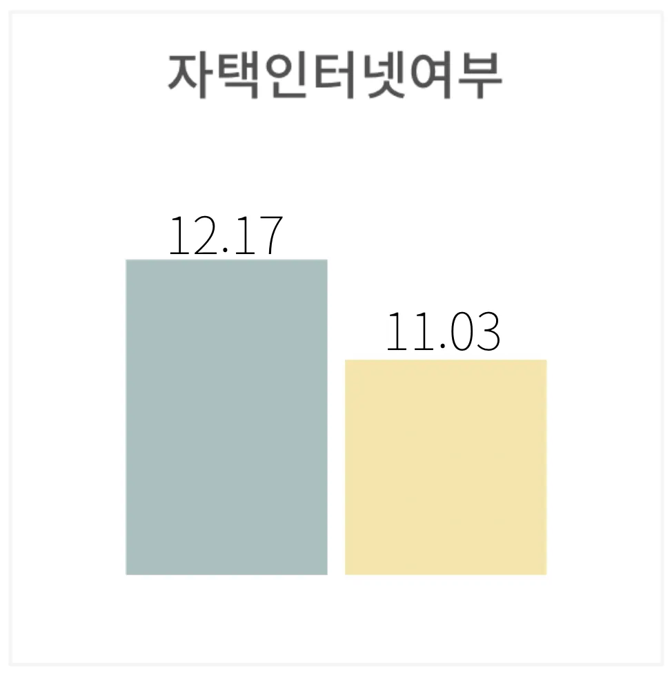 자택에서 인터넷 사용이 가능한지 여부에 따라서(회색: 사용가능, 노란색: 사용 불가능) 평균 1점 이상의 차이가 발생했다.