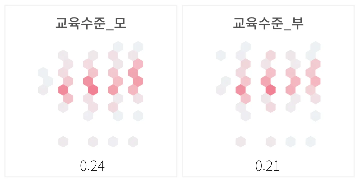 부모의 교육수준과 총점수는 약한 양의 상관관계를 보였는데, 이 중에서도 어머니의 교육수준과 더 높은 상관관계를 보였다(모: 0.24, 부: 0.21)
