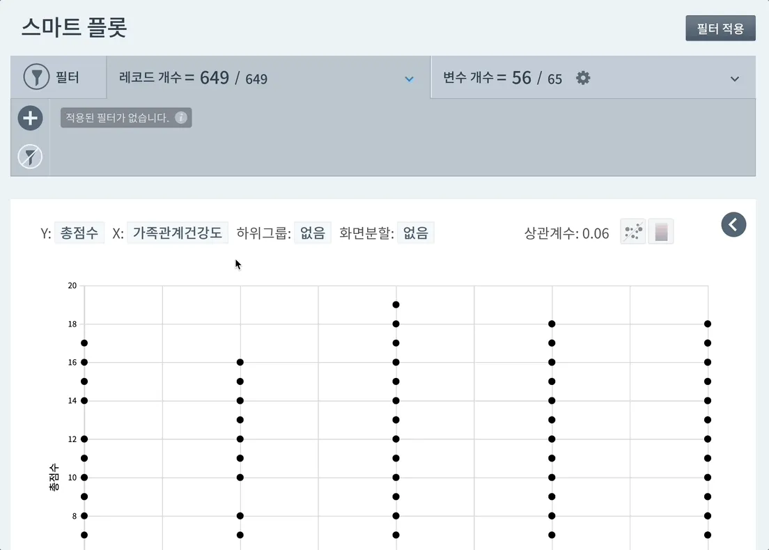 또한 가족관계가 좋을수록 성적이 좋을 것이라는 추측을 해 볼 수 있겠지만, 상관관계는 0에 가깝다.