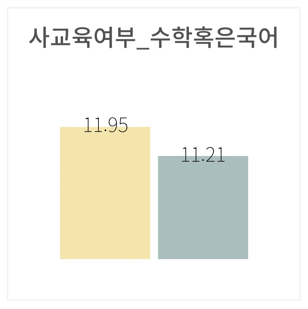 사교육 여부에 따라서는 오히려 사교육을 받을 때(회색) 평균적으로 성적이 소폭 낮았다(11.21). 그러나 그 차이가 크지 않아 유의미한 차이는 아닌 것처럼 보인다.