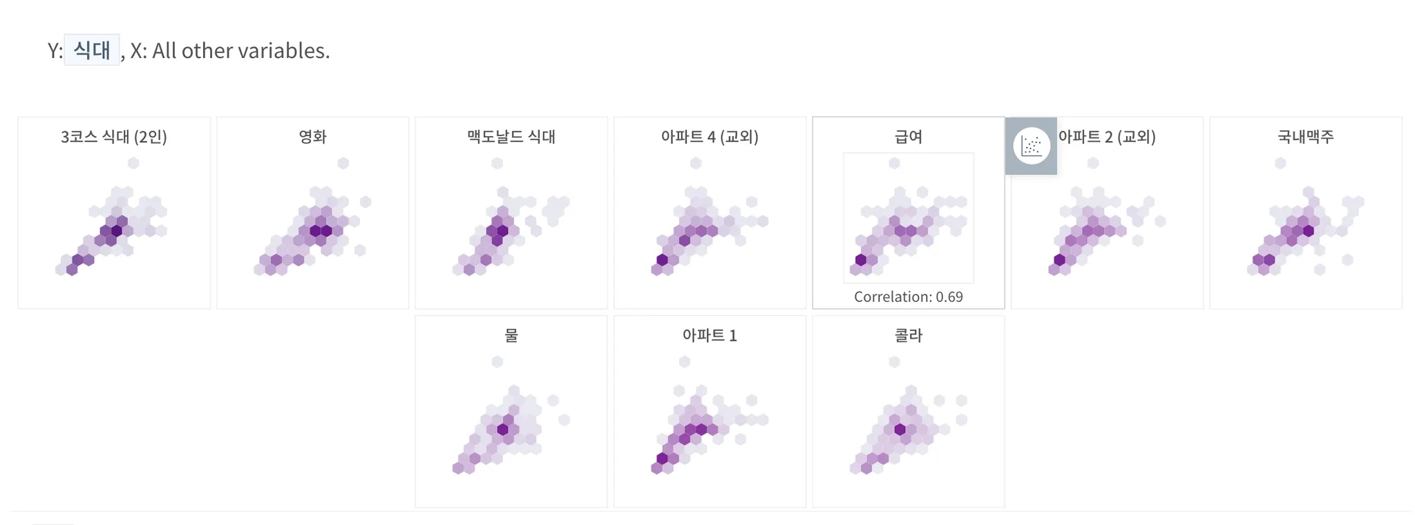 외식, 주류, 식음, 교통, 차량, 담배, 생활, 통신, 교육, 의류, 주거, 급여, 금융비용