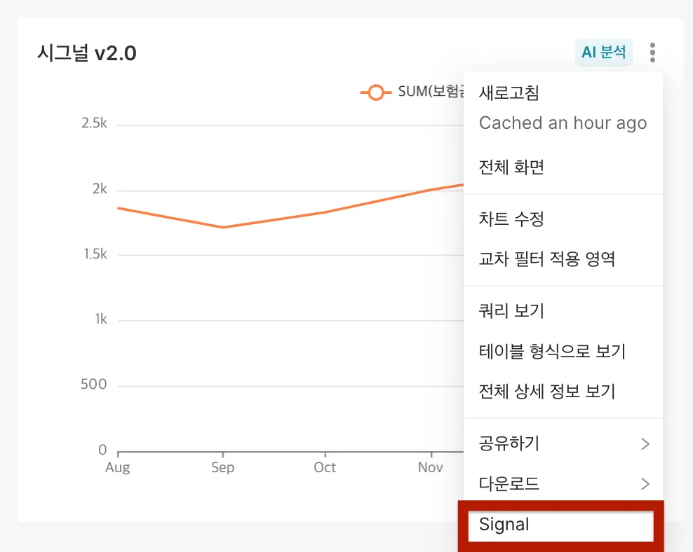 [AI 분석] 버튼 옆에 있는 토글 메뉴를 클릭 후, 가장 아래에 있는 시그널 버튼을 누르면 자동으로 시그널 일정(알림 및 보고서)이 생성됩니다.