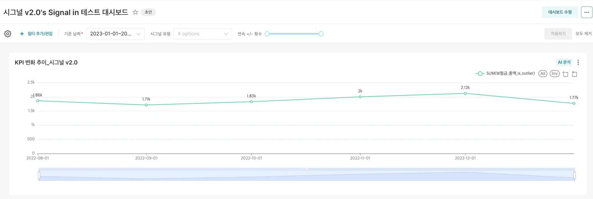 시그널 기능은 사용자가 생성한 차트 정보를 활용하여 시그널을 탐지하고, 이를 바탕으로 대시보드를 자동으로 생성합니다. 이를 통해 사용자는 복잡한 데이터 분석 과정 없이도 중요한 데이터 변화를 식별하고, 이를 쉽게 시각화할 수 있습니다.