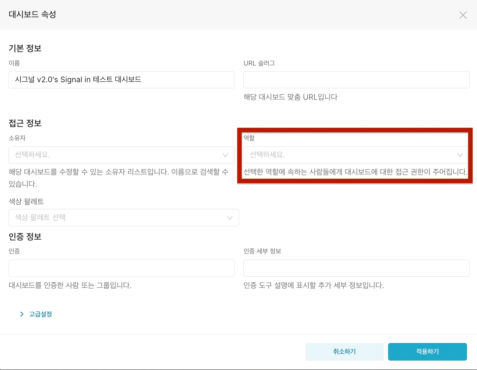 방법1: 대시보드 내부의 대시보드 수정 > 토글 메뉴 > 속성 수정하기 > 역할 수정하기에서 접근 권한을 줄 역할 선택