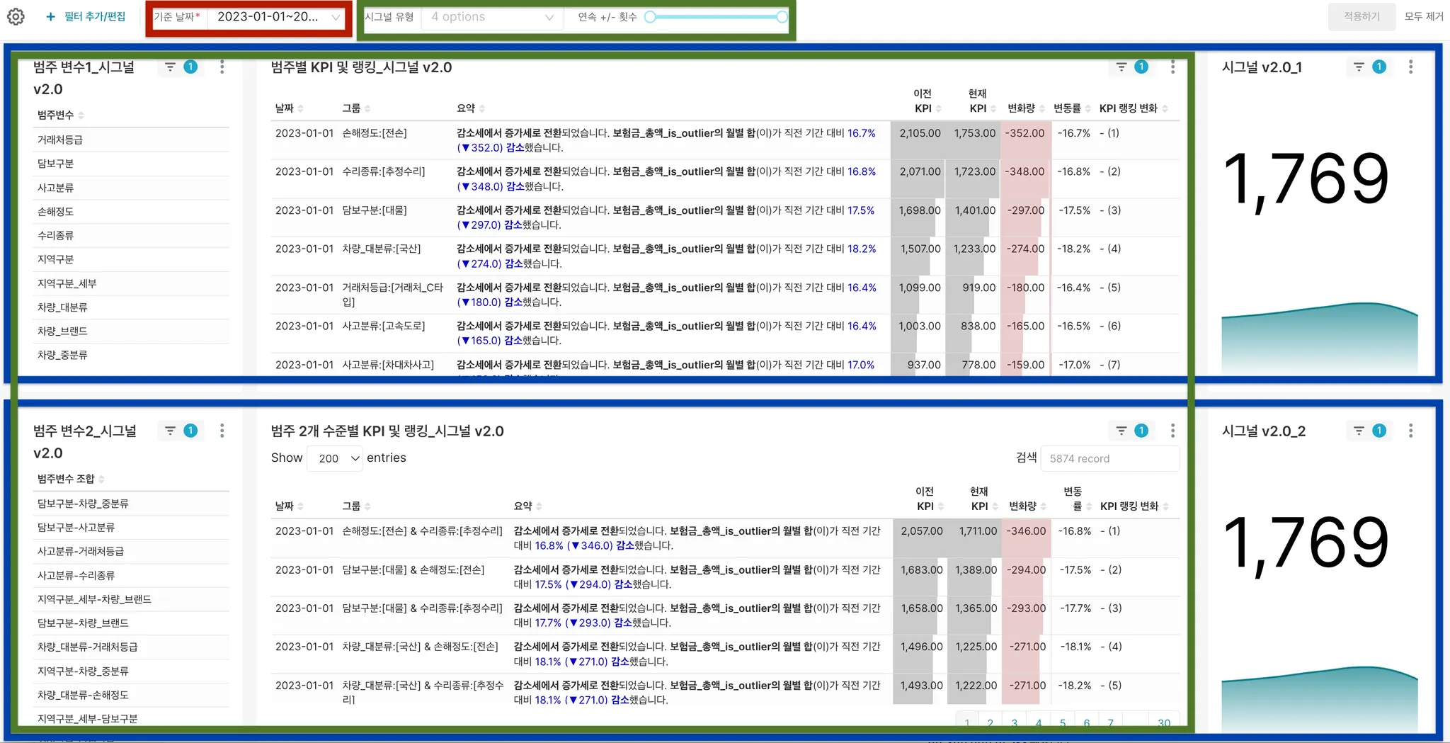 시그널 기능은 범주형 변수를 그룹화하여 각 그룹 내에서 발생하는 변동을 자동으로 감지하고 분석합니다. 이를 통해 사용자는 어떤 그룹에서 변동이 크게 일어났는지 한눈에 파악할 수 있습니다. 사용자는 데이터를 직접 분석하지 않고도 중요한 패턴과 주목할 만한 추세 또는 이상치를 발견하고, 효율적인 의사 결정을 지원받을 수 있습니다.