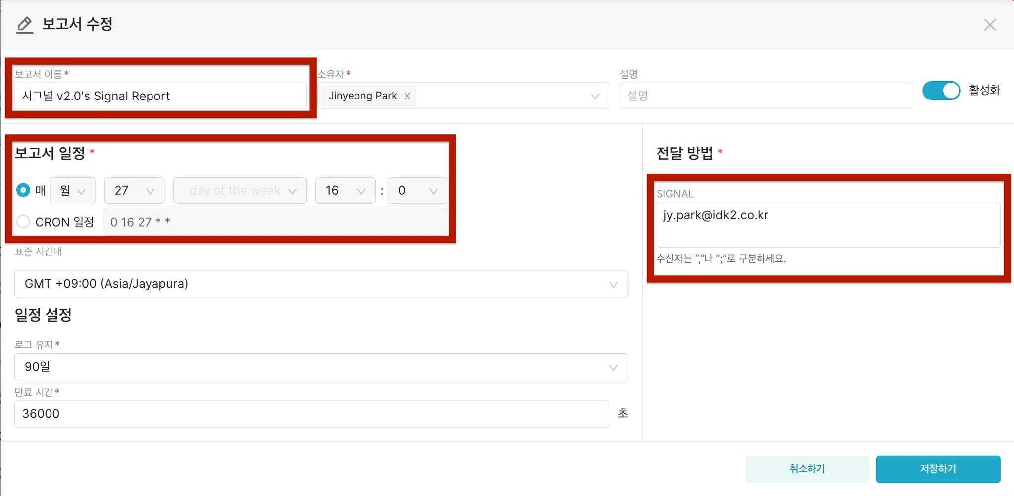 보고서 일정 의 변경을 통한 시그널 뉴스레터의 발송 및 시그널 데이터셋 갱신 주기 설정