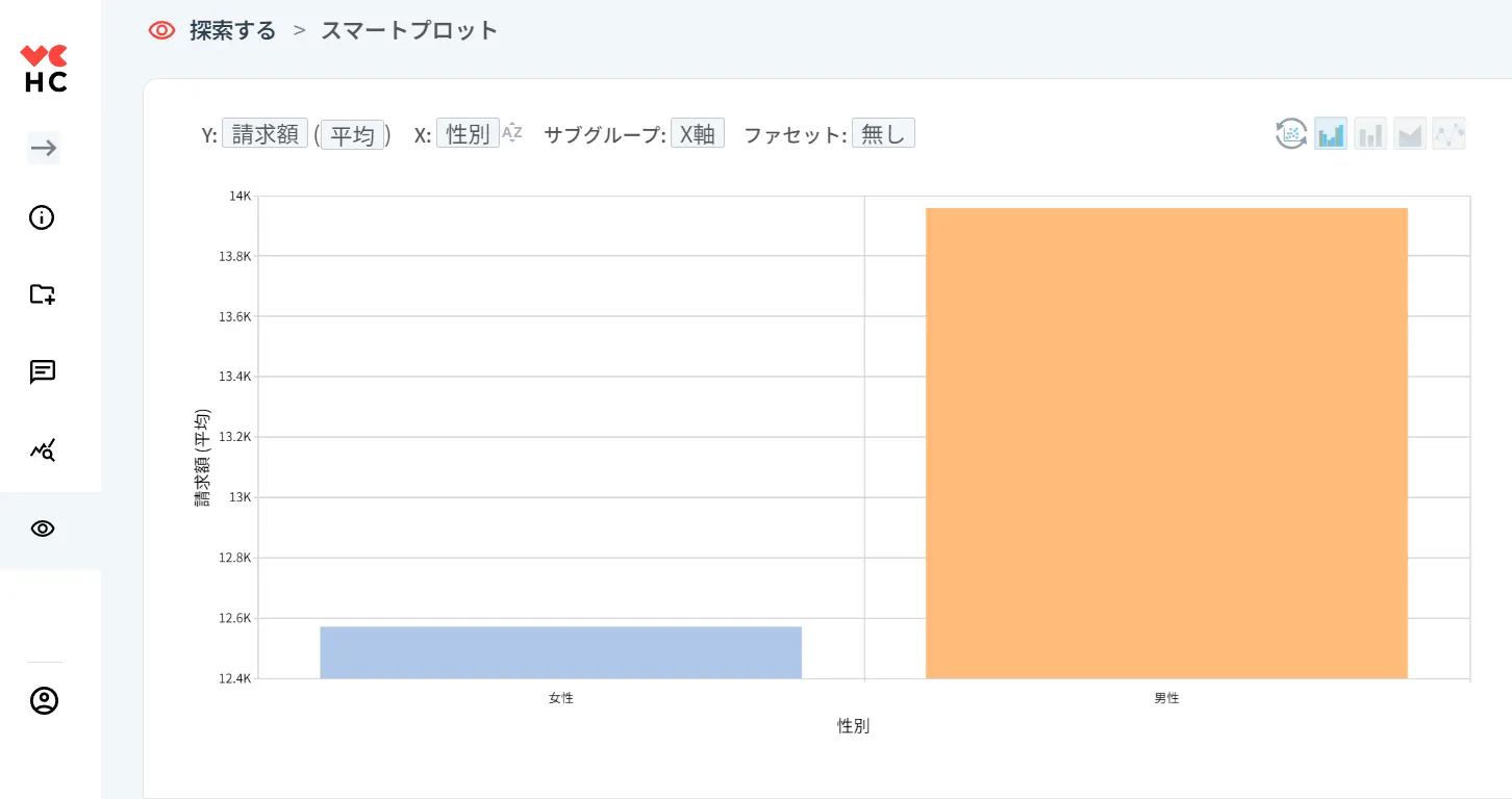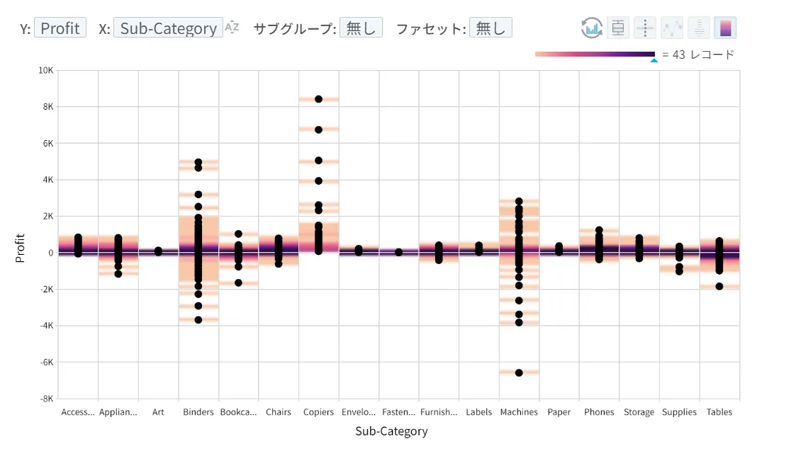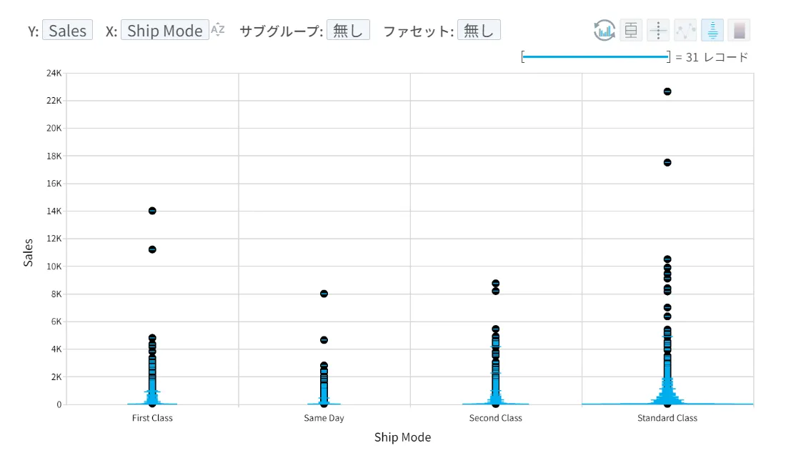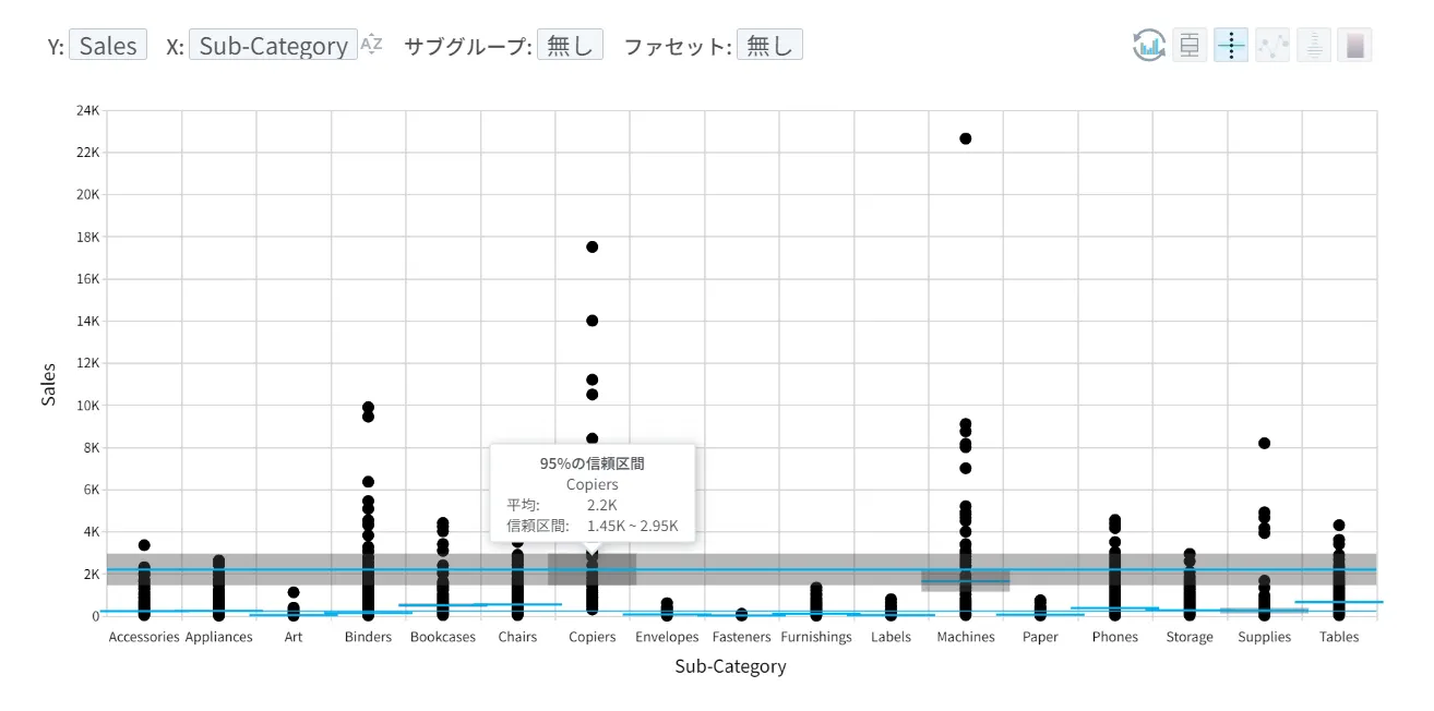 X軸にカテゴリー型変数を指定すると、各カテゴリーに対するY軸の値の分布を確認することができます。右上には以下のような6つのボタン(棒グラフ、箱ひげ図、95%の信頼区間、トレンドライン、分布、ヒートマップ)が表示されます。