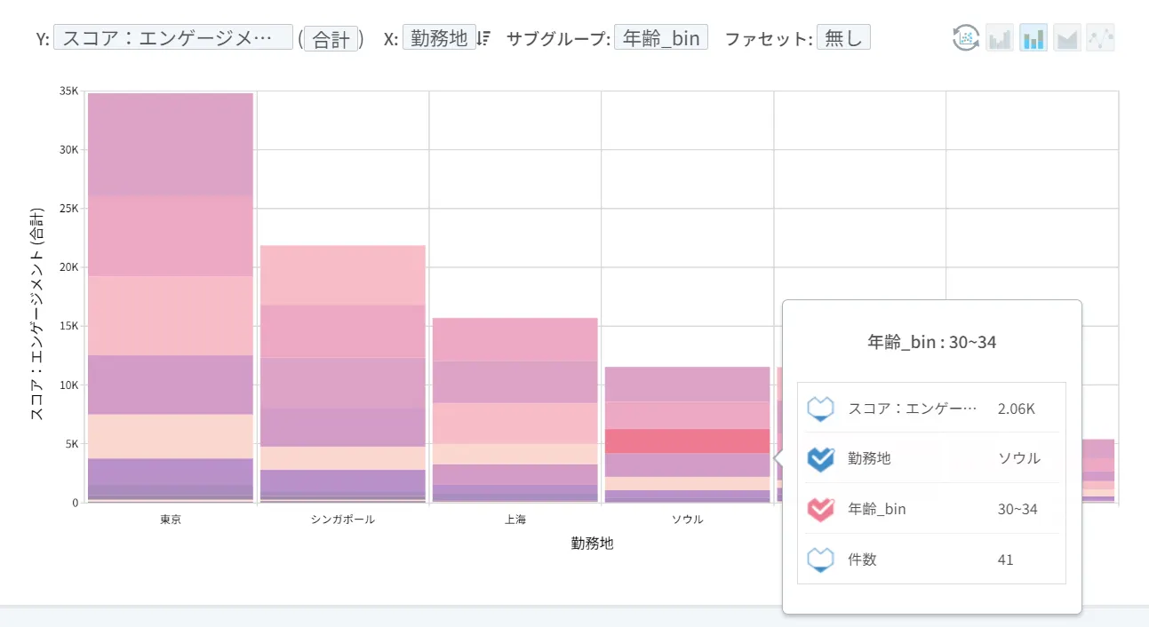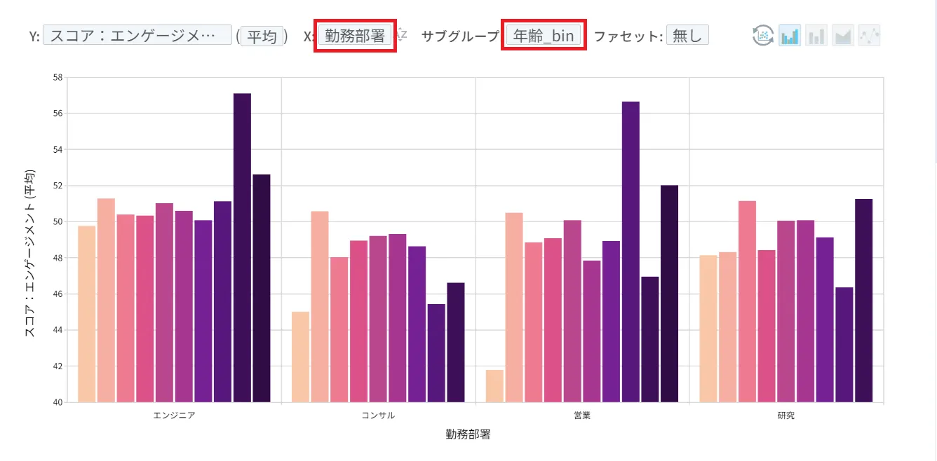 グループ化された棒グラフでは、1番目のカテゴリーをX軸に配置した後、2番目のカテゴリー(サブグループ)を1番目のカテゴリそれぞれの中に配置します。以下の例は、X軸にカテゴリー型変数「年齢_bin」を選択し、サブグループに2番目のカテゴリー型変数として「勤務部署」を選択したグラフです。