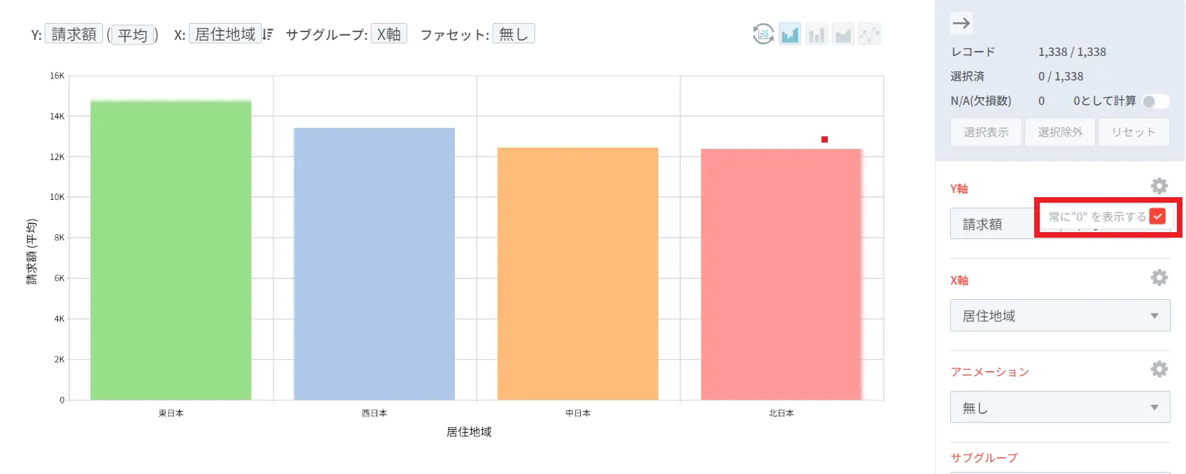上の画像では、Y軸の値の始点が 12.2K(12,200) となっていますが、始点を 0 に変更したい場合は、視覚化画面の右側のコントロールウィンドウで [常に"0" を表示する] をクリックします。