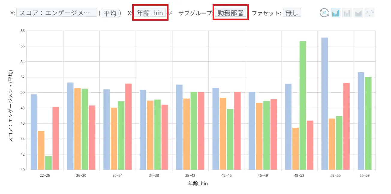 グループ化された棒グラフは、カテゴリーの数が多すぎると解釈が難しくなります。勤務部署別の年齢による従業員の満足度の違いであれば、X値とサブグループとを入れ替えて以下のように表示することもできます。