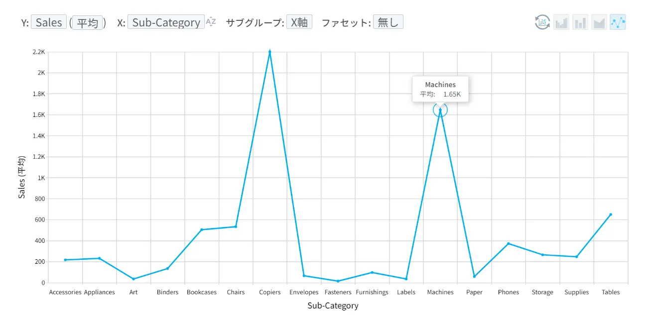 各カテゴリーの平均値をつないた形で全体のトレンドラインを把握することができます。右側のコントロールウィンドウを使ってX軸の並び替え方法を変更し、トレンドを一目で見ることができます。データポイントをクリックすると、対応するカテゴリーの平均値が表示されます。