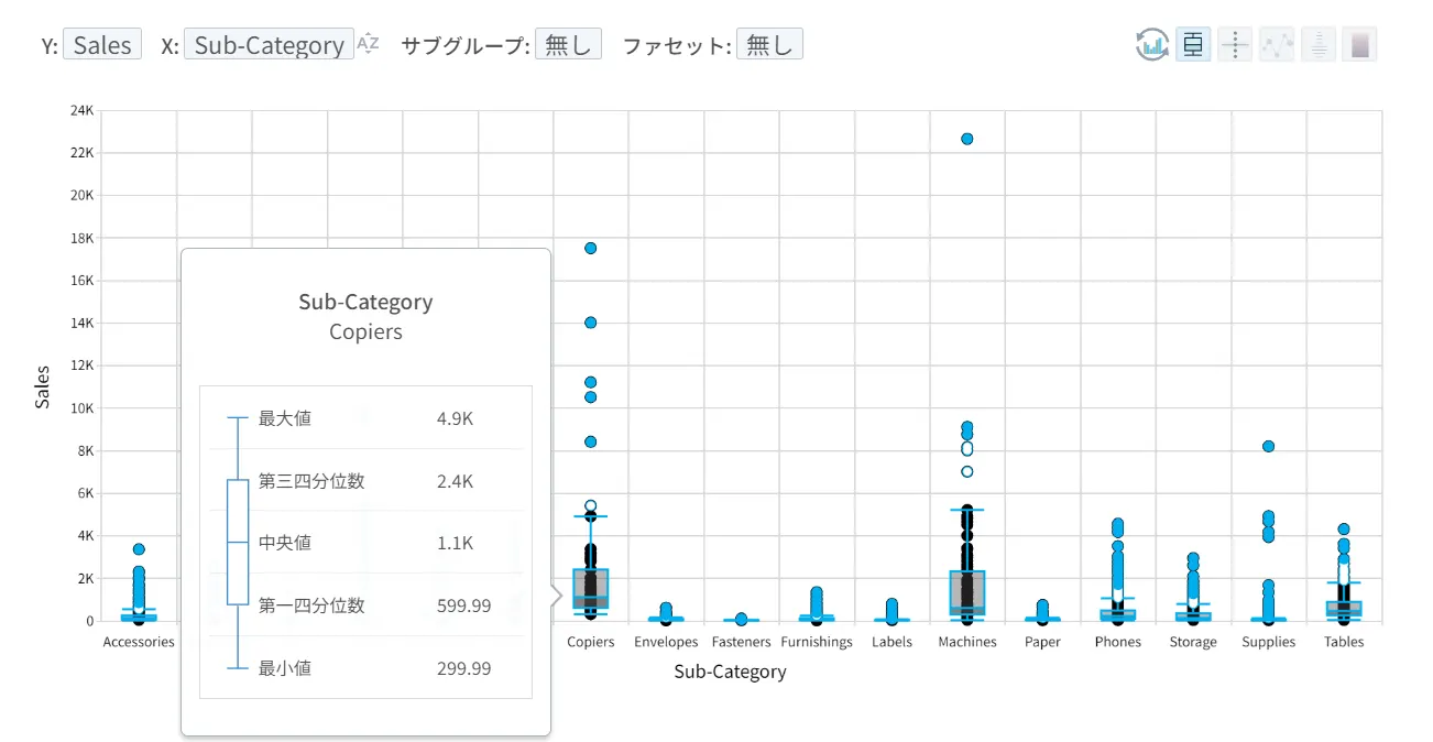 右上の 箱ひげ図 アイコンをクリックすると、視覚化画面に箱ひげ図が表示されます。その中から1つのボックスプロットをクリックすると、各カテゴリの詳細な値を確認することができます。