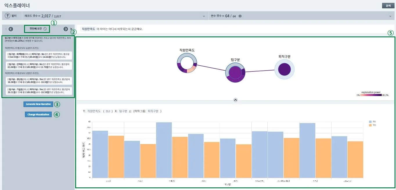 즉, 앞서 KPI로 설정한 [직원만족도]가 평균보다 높거나 낮은 조건을 나타냈지만, Generate New Narrative 버튼을 클릭하면 [직원만족도] 총합에 기여도가 가장 크거나 작았던 조건의 조합을 보여줍니다.
