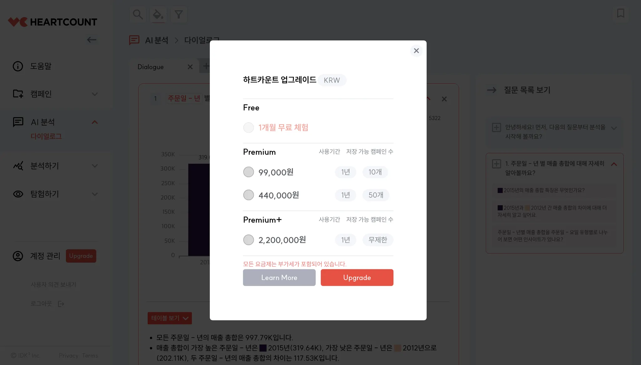 ‘분석하기’ 메뉴를 이용하려면 캠페인을 계정 서버에 저장해야 하는데요. 그러려면 HEARTCOUNT 프리미엄으로 업그레이드해야 합니다. 1개월 무료 체험이 가능하니, 좌측 메뉴의 Upgrade 버튼을 클릭해 무료 체험 먼저 진행해 보세요.